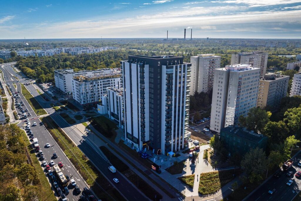The new 17‑floor tower, completed in September 2025, stands at 55 metres tall at the intersection of Czerniakowska Street and Polskiego Walczącej Avenue, just south of the Sielcach district. It hosts 164 residential units and a commercial ground floor.