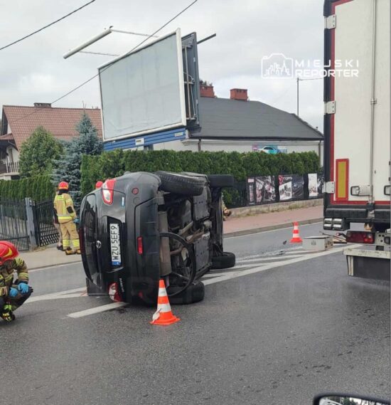 The incident occurred around 3:15 PM on Warsaw Street in Ząbki, Wołomiński County. A Nissan and a Mercedes were involved in the crash, where the Nissan flipped over onto its side.