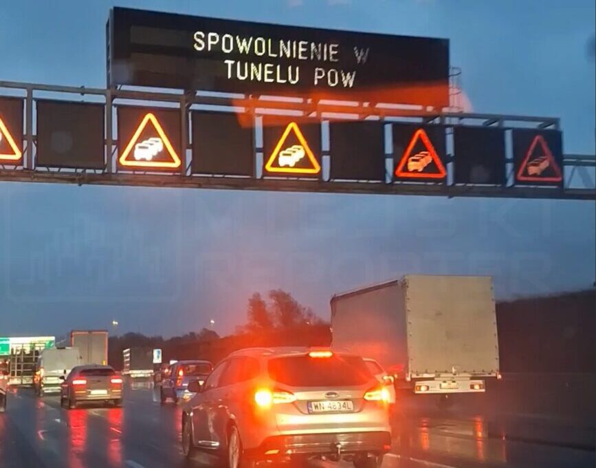 A 21‑kilometre stretch of Poland’s S2 motorway near Warsaw is clogged after a three‑car collision in the Southern Ring Road tunnel, forcing motorists to spend almost 50 minutes on the route.