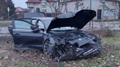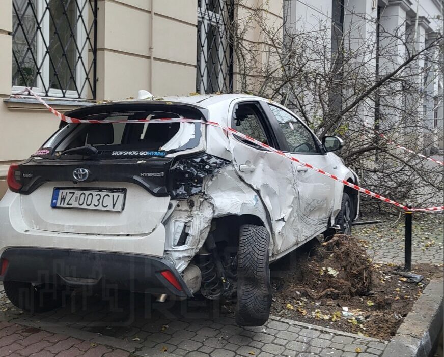 According to preliminary findings, the driver was moving at high speed on Wilcza Street. He lost control and struck the parked Toyota, which was forced from its parking bay onto the sidewalk. The impact was strong enough to eject the Toyota from the bay.