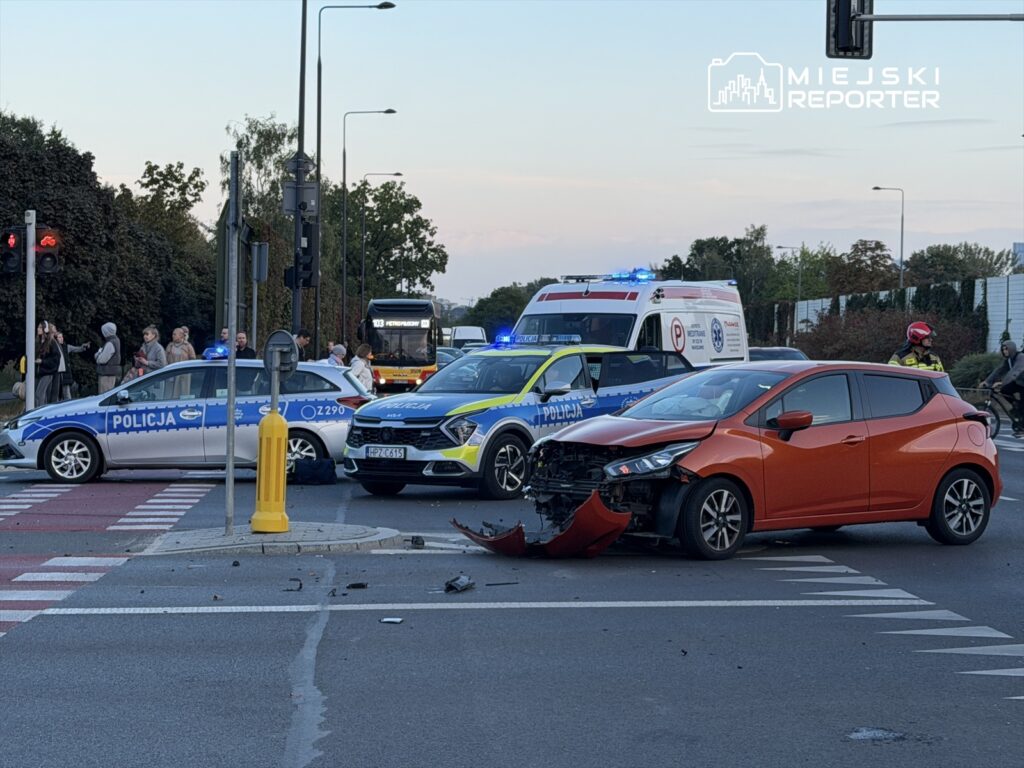 At 16:56 on Oct. 3, an ambulance operating under emergency signals collided with a Nissan at the crossing of Gen. Maczka and Rudnickiego streets. The ambulance entered the intersection on a red light, forcing the Nissan driver to brake and resulting in the impact.