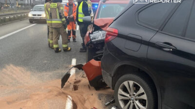 The Audi RS3 has driven into and lies atop the Mitsubishi. The scene is secured by municipal fire personnel while police patrols await to conduct further investigations. No injuries were reported.