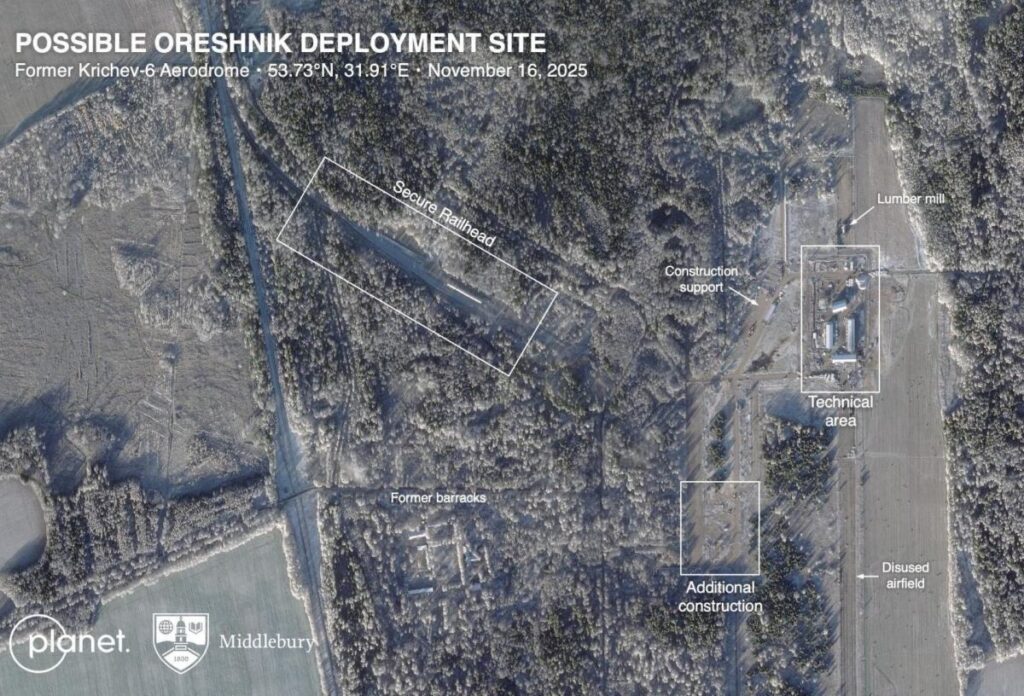 Jeffrey Lewis of the Middlebury Institute of International Studies and Decker Eveleth of the CNA research organization analyzed satellite images indicating that roughly 90% of the mobile launchers for the Boreas ballistic missile will be located at a former airbase near Krzyczew in the Mogilev region of eastern Belarus. Construction work, conducted in haste between 4 and 12 August, revealed a setup resembling a Russian strategic missile base, as reported by Reuters. A November image shows a military transfer point with rail lines capable of delivering missiles and mobile launchers, suggesting that the former base could accommodate three rockets; the remaining rockets would be stored elsewhere.