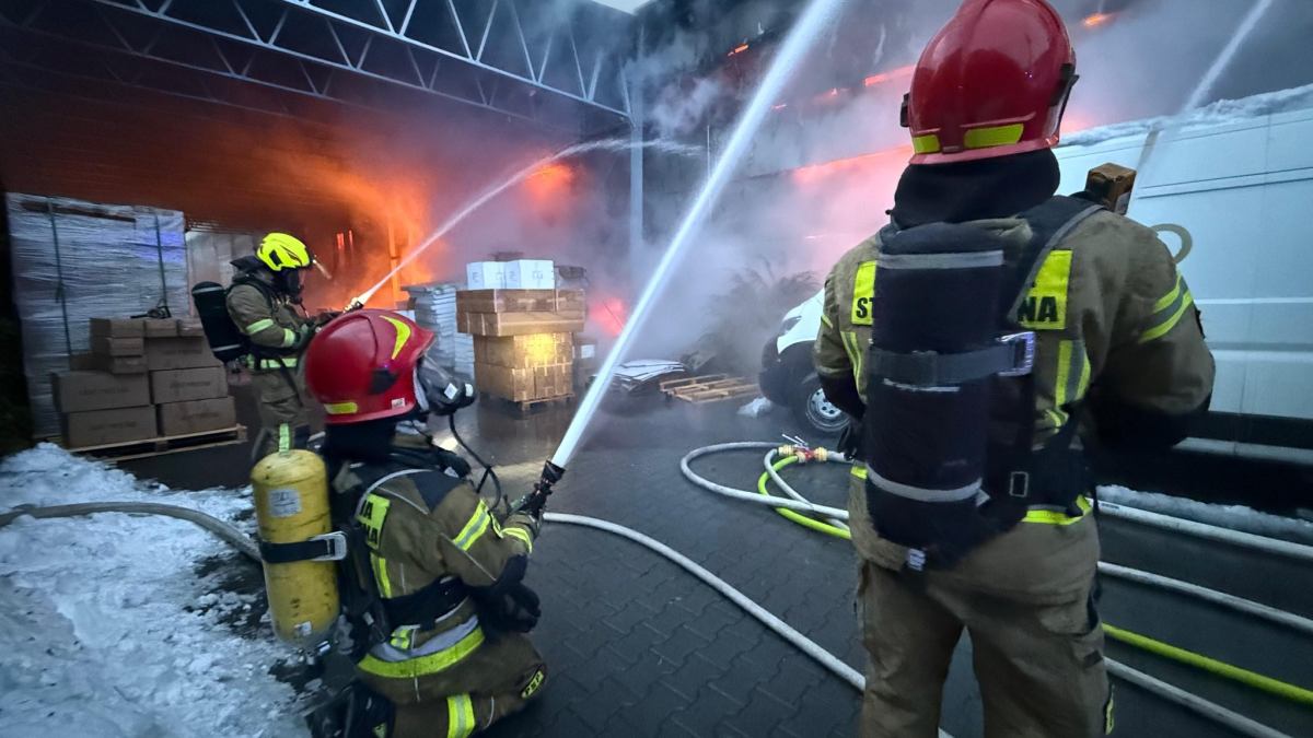 At approximately 14:28 on Monday, a fire erupted in a warehouse and covering shed on Torowa Street in Skawina, Poland. The hall covers about 1,270 m² and stored lamps among other items.