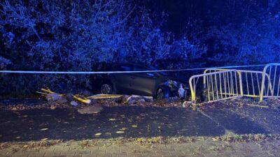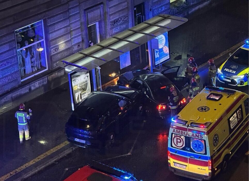 At 10:55 p.m. on Koszykowa Street in Warsaw’s city centre, a BMW and a Land Rover collided and crashed into a bus stop, wounding two people.