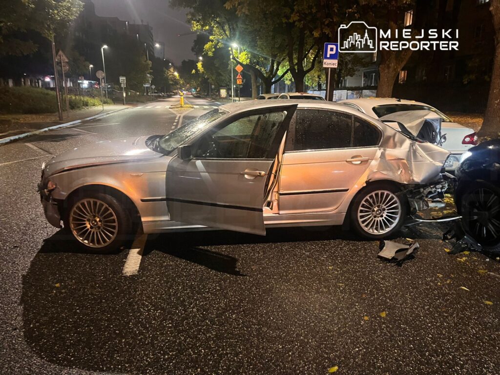 A traffic police call arrived at 23:28 reporting a collision on the street with designated parking spots in Mokotów. The driver of a BMW, a Ukrainian citizen, lost control and skidded, striking five parked cars and the green‑space separation posts.