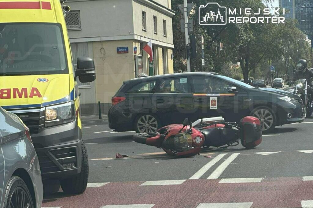 A Honda motorcycle and a BMW car collided at a busy intersection in Wola, Warsaw, leaving the motorcyclist hospitalized. Police are investigating the incident.