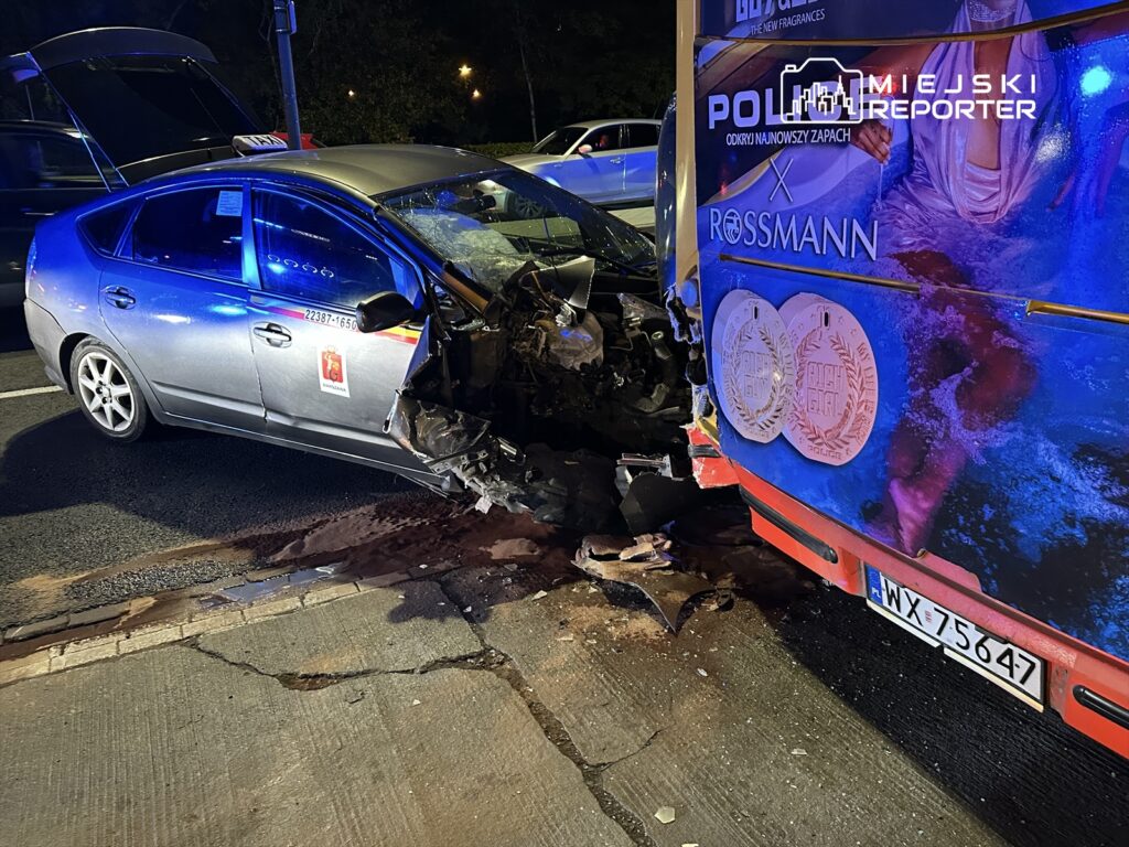 A Toyota Prius carrying passengers collided with a stationary 192 bus on Rosolska Street at 5:15 p.m. on October 22, leaving two passengers hospitalized in Warsaw.