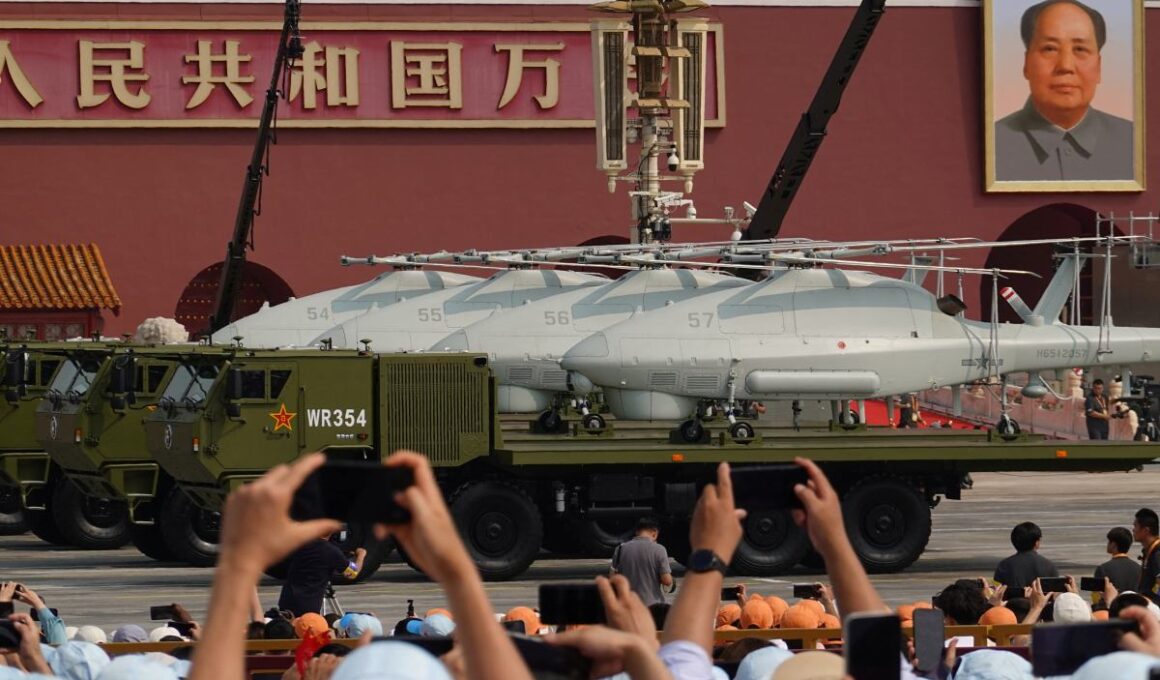 For the first time, China officially displayed stealth-capable drones thought to be one of their own versions of the RQ-170 Sentinel. Four large drones followed, suspected as “loyal wingman” prototypes that would accompany manned fighters. The parade also showcased a range of new naval drones, including three unmanned helicopters and two underwater drones.