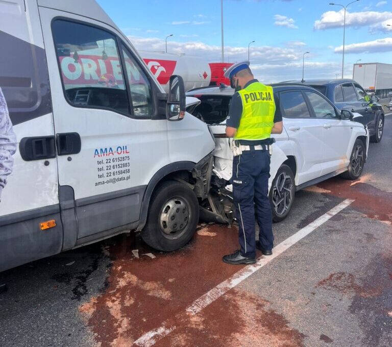 On the S2 route near the Kraków region, a collision involving three vehicles took place: an Iveco bus ran into the rear of a Hyundai sedan, which then struck a parked Audi.