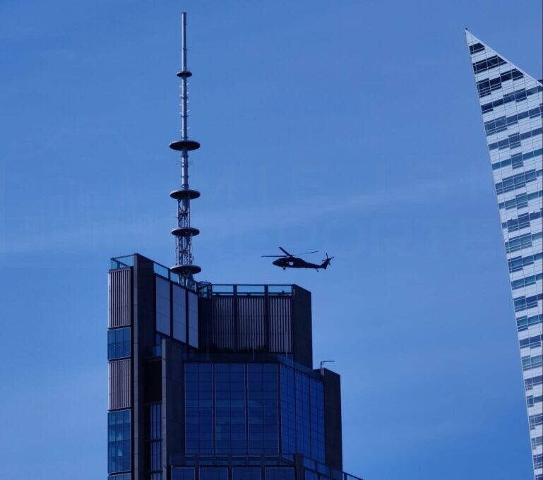 On-site observations show a police Black Hawk helicopter flying at low altitudes near the tower’s terrace and performing circling maneuvers. However, it remains unclear whether this is the only location being practiced today.
