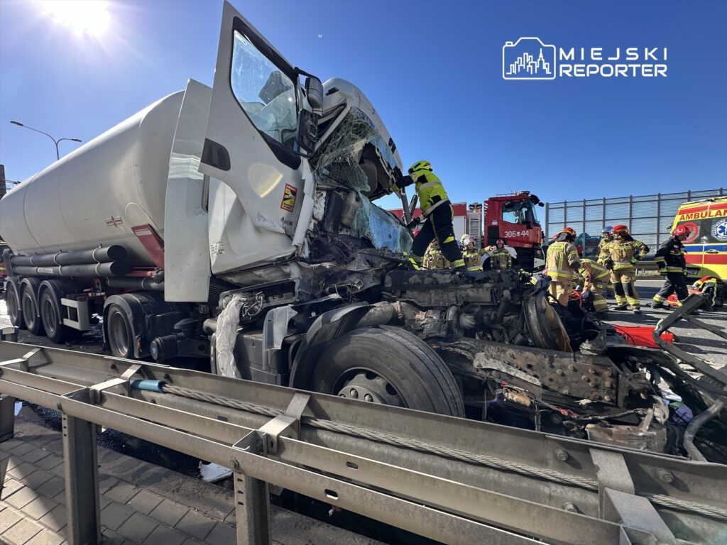 A serious accident involving two trucks and a van occurred on the S2 route near Ursus, trapping one person and prompting a large-scale rescue effort.