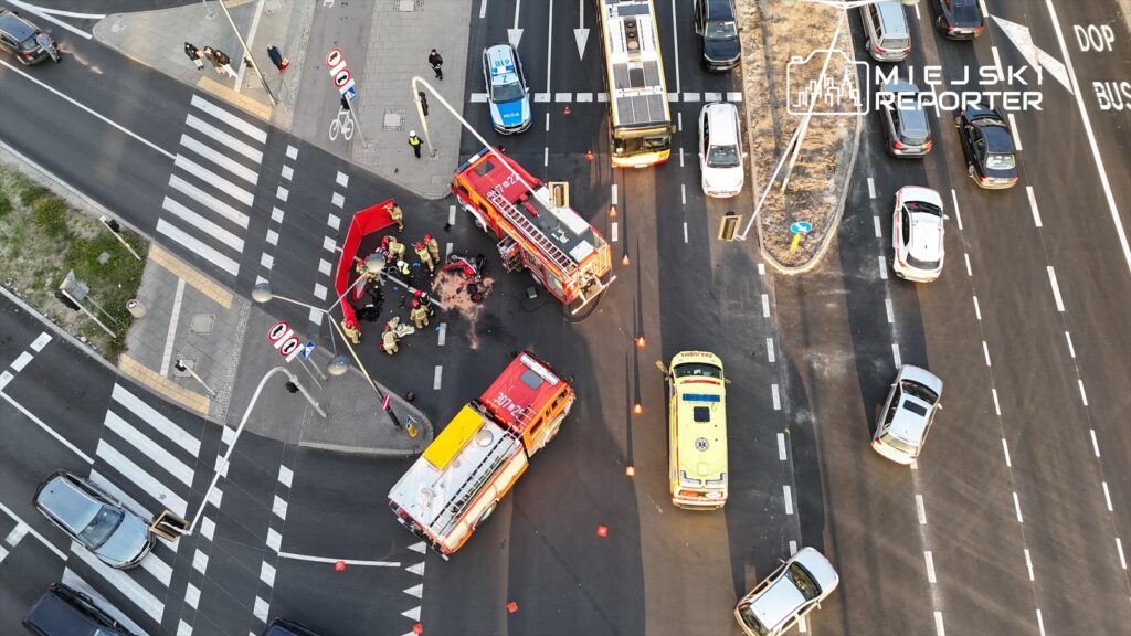 In the afternoon, a car traveling from Ożarów on Połczyńska made a prohibited left onto Powstańców Śląskich, striking a motorcycle. The rider suffered serious injuries and was taken to hospital. Traffic flow halted during the evening peak.