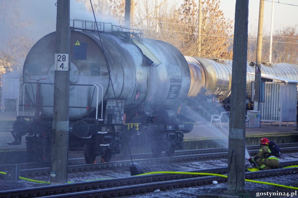 On Thursday, December 25, near the PKP station in Gostynin, a liquid sulfur tanker with a damaged tank released thick smoke and vapors, prompting firefighters, police, and a specialist chemical team to secure the area.