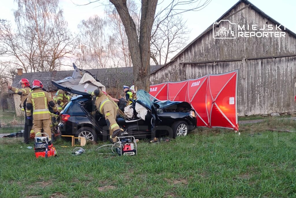 The force of the impact trapped the driver inside the wrecked vehicle. Firefighters, medical rescue teams, and the Ratownik12 helicopter were dispatched to the scene.