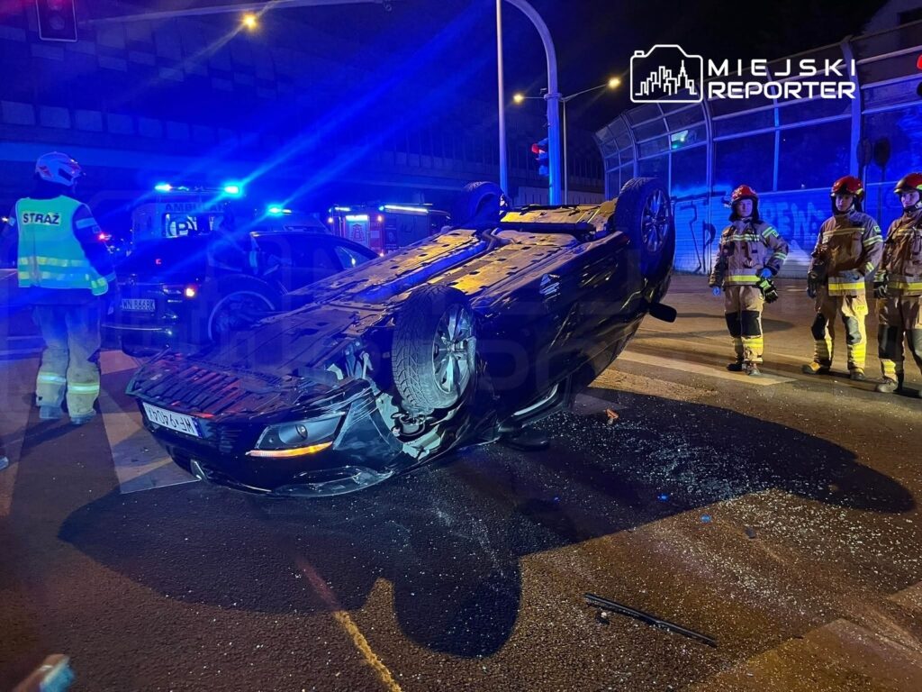 A Renault overturned after colliding with a BMW in Marki, Poland, early Sunday morning; the Renault driver was found to be intoxicated.