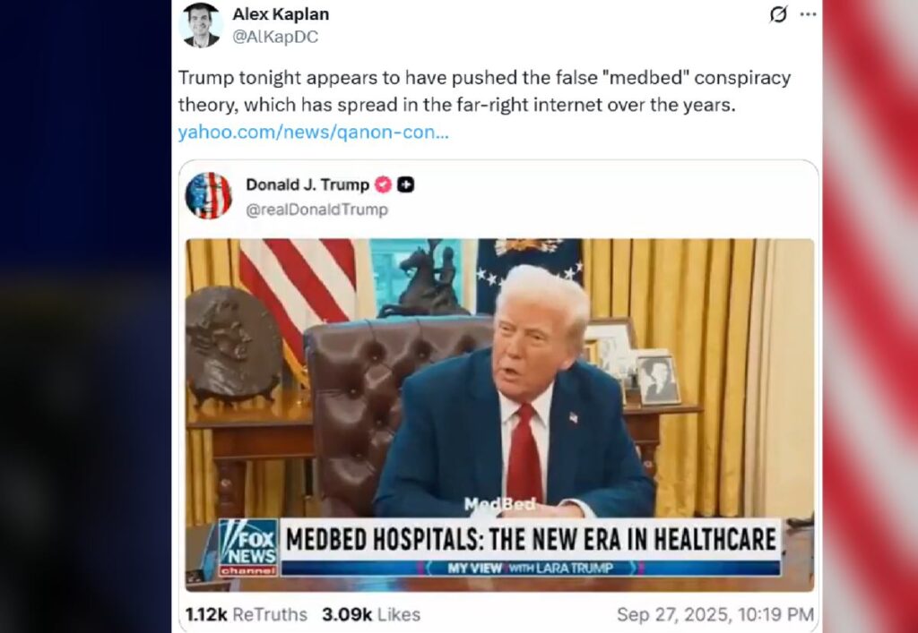 A fake video appeared on Donald Trump’s Truth Social profile on Saturday, September 27, allegedly from a Fox News program hosted by his daughter-in-law, Lara Trump. The clip claimed that every American would soon receive a “MedBed” card, guaranteeing access to cutting-edge hospitals staffed by top doctors. Trump reportedly stated these facilities would restore citizens to full health and strength.
