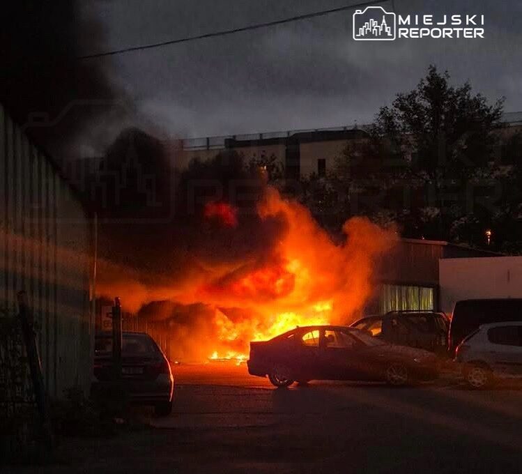 A fire erupted around 6:30 PM at a metal-clad building on Bartycka Street, which housed an electric bicycle service. Upon arrival, firefighters found the entire structure engulfed in flames, with electric bicycles and stored batteries inside.