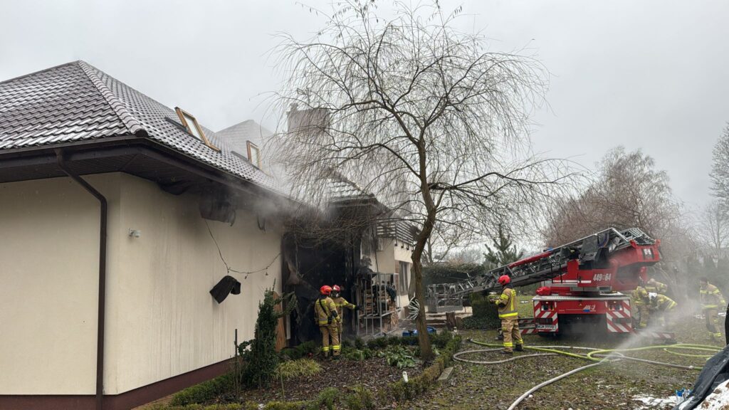 In Starych Budach village, just before 10 a.m., a single‑family house on Szuberta Street erupted in flames, prompting eight fire‑rescue crews to respond.