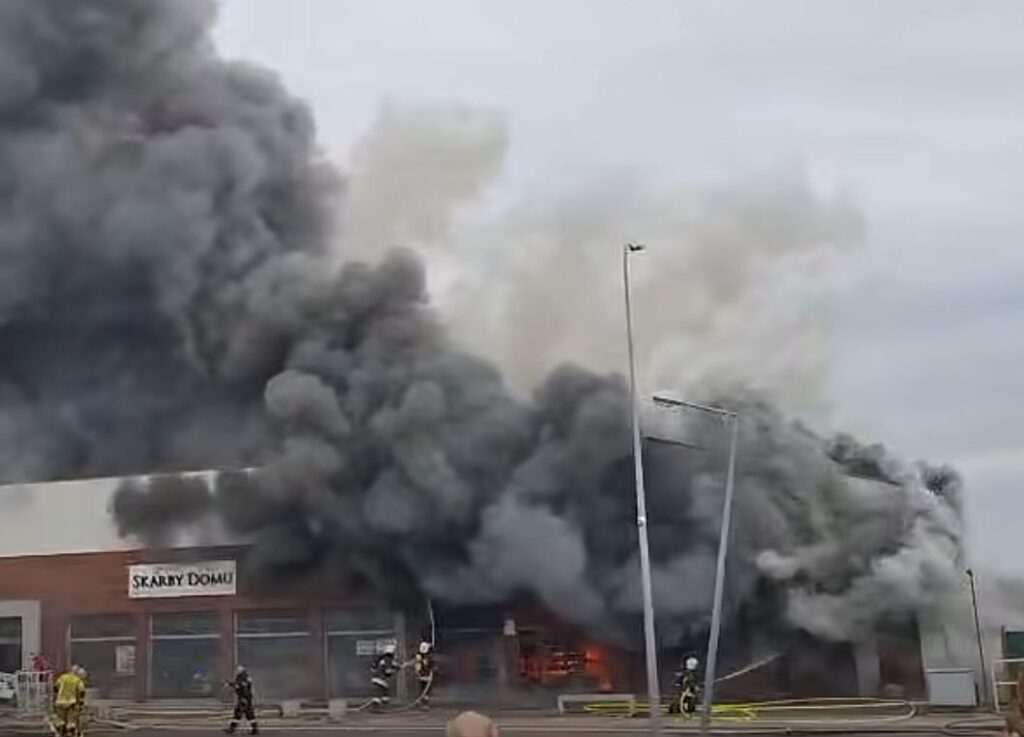 A fire erupted Tuesday morning at a shopping center in Pomerania, Poland, prompting evacuations and a large-scale firefighting response.