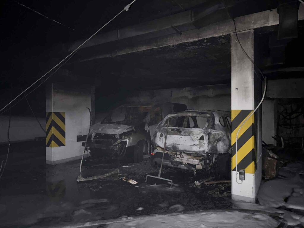 The fire broke out around 21:30 and rapidly spread to additional cars parked in the garage. As a result, five vehicles were destroyed. High temperatures also damaged electrical cables and water supply lines, complicating firefighting efforts and impacting residents.
