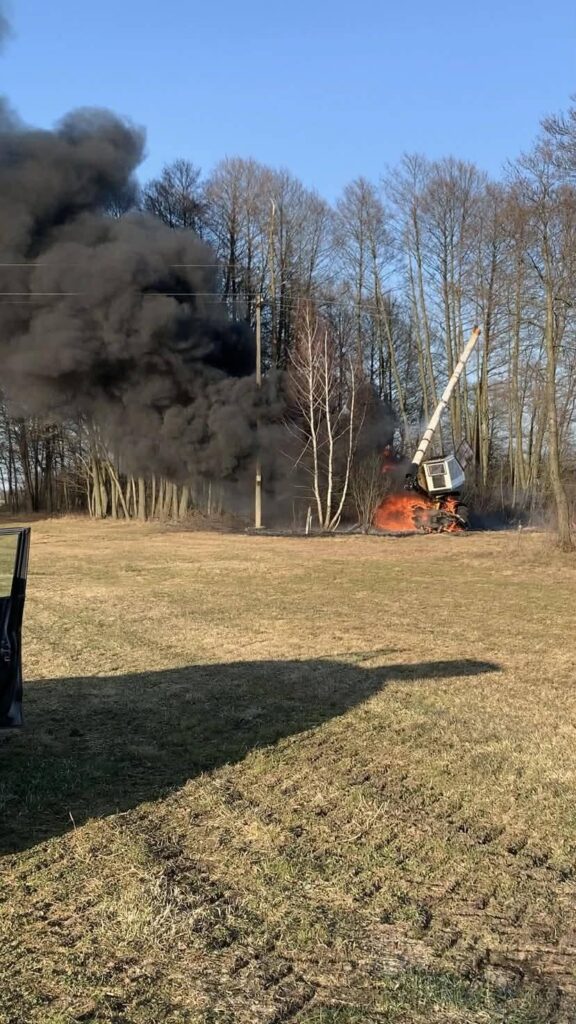 On Monday, March 9, 2026, a forest machine caught fire in Franciszków, Wołomin County. The vehicle was completely engulfed in flames, with thick black smoke rising over the incident site.