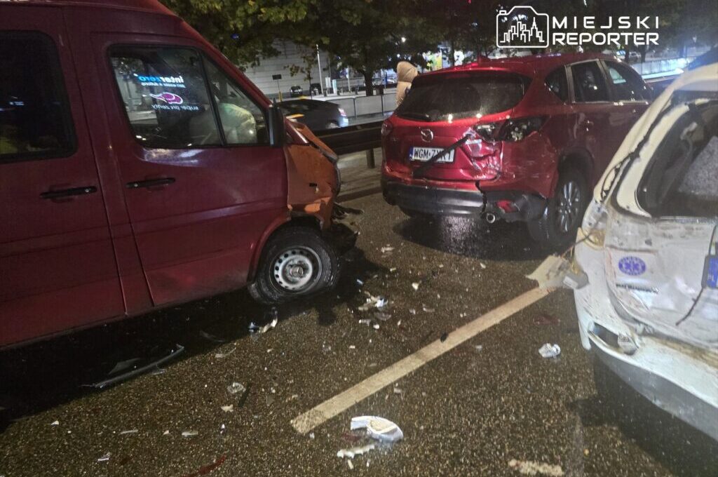 A chain‑reaction collision involving four vehicles on the Jerusalem Avenues near the CH Reduta on Monday, Oct 6, forced two lanes toward Pruszkow to close until about 20:30, with no injuries.