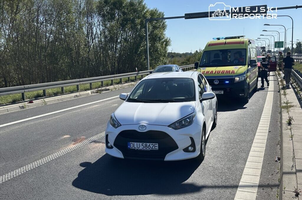A four-vehicle collision occurred on the S7 highway near the Lotnisko intersection in the direction of Warsaw, involving a motorcyclist who received medical attention.