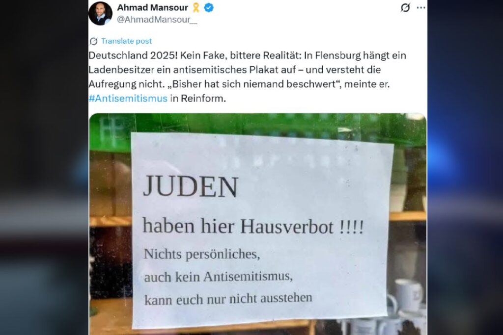 A 60-year-old German shop owner displayed a sign in his storefront saying “Jews are not allowed here,” sparking widespread outrage and condemnation in Flensburg.