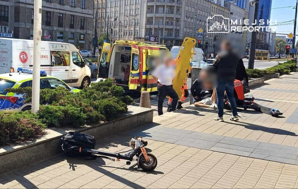Approximately at noon on Ochota, a severe collision between two men using electric scooters took place near Al. Jerozolimskich 56C, close to the PKP Żelazna building. The incident occurred on the sidewalk.