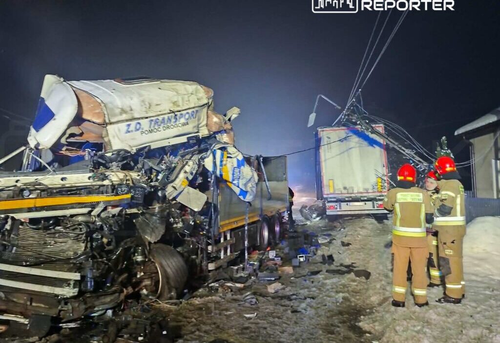 A serious collision occurred between two trucks on provincial road 579 in Kazuń Bielany, Nowy Dwór County. According to preliminary findings, one driver drove onto a pedestrian refuge island, causing the vehicle to skid and collide head-on with an oncoming truck.