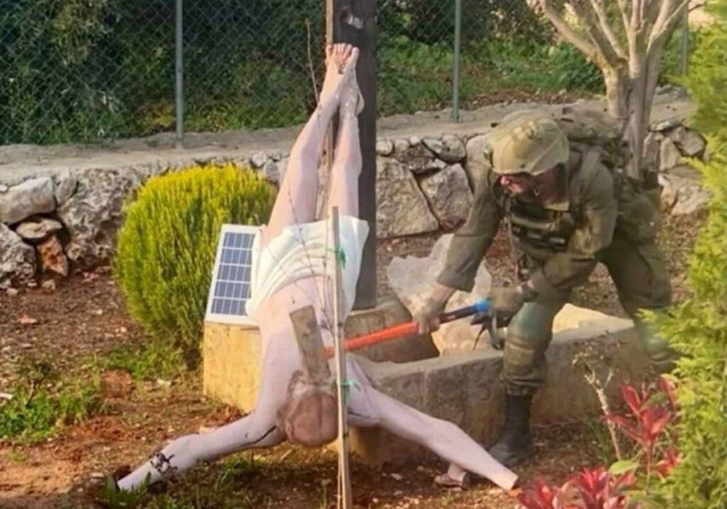 A photograph depicting an Israeli soldier damaging the head of a statue of Christ was published by Palestinian journalist Younis Tirawi on social media. The incident occurred during military activity in southern Lebanon.