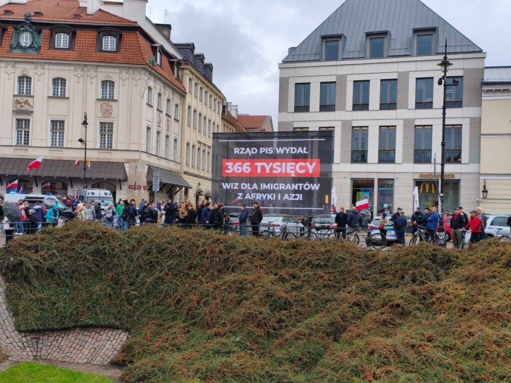 During the Saturday demonstration in Warsaw’s Castle Square, a large banner by Konfederacja read that the PiS government had issued 366,000 visas to migrants from Africa and Asia. The figure is cited in a 2023 report of the Supreme Audit Office covering 2018‑2023, stating that the visas were granted to citizens of 76 Muslim and African countries.