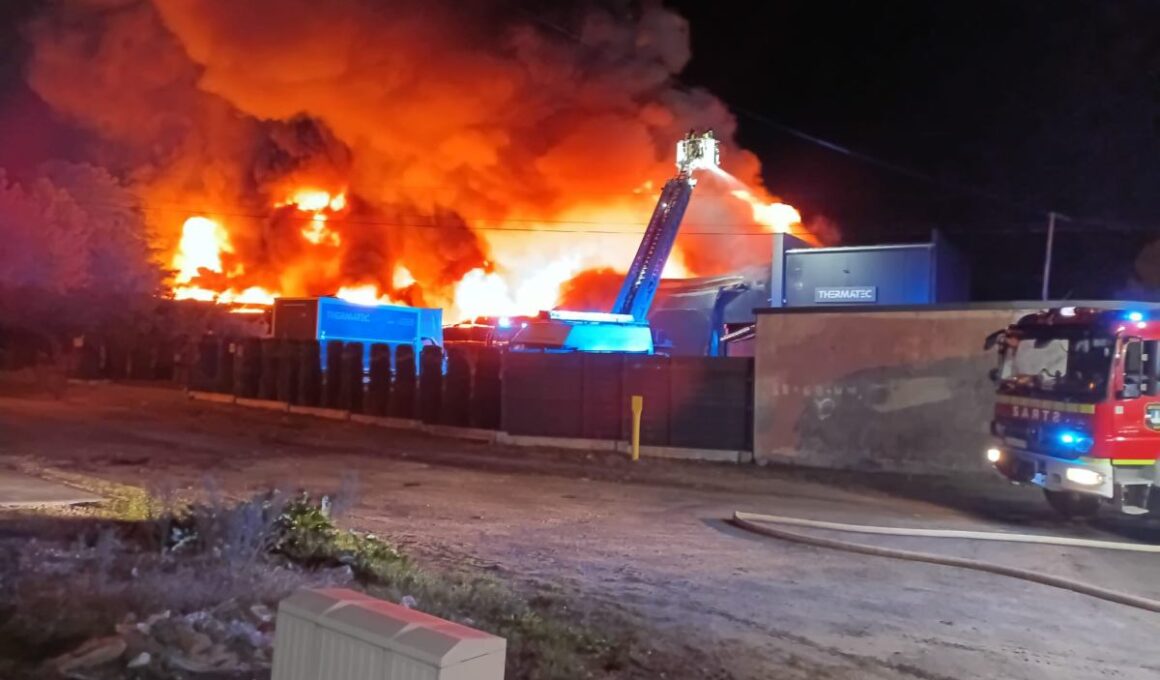The fire occurred at a production and warehouse hall of the Thermatec company, located on Rzemieślnicza Street in Czeladz, Silesian Voivodeship. According to reports from “Dziennik Zachodni,” the company manufactures heat pumps. The facility is approximately 65 meters by 15 meters, with a separate administrative section of about 8 meters by 15 meters.