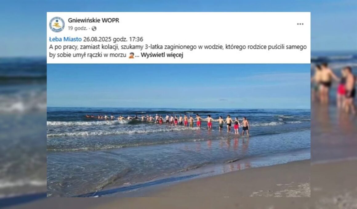 The incident occurred on Tuesday (August 26) at around 5:00 PM in Łeba. “We are searching for a 3-year-old child who went missing in the water after parents left him alone to wash his hands in the sea,” stated the Water Rescue Volunteers (WOPR) in Gniewino. A chain of life was established during the search, and the child was later located on the beach, unharmed. The rescue team urged parents: “Dear citizens, there are five days left until the end of your vacation: be cautious, be safe.” They also shared a video from the operation.