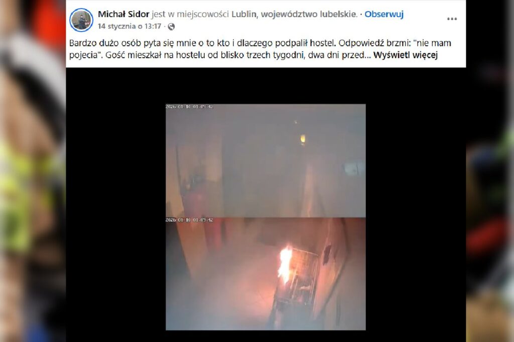 On Saturday, January 10, a fire broke out at a hostel on Przesmyk Street in Lublin. The owner of the facility, Lublin entrepreneur Michał Sidor, published footage recorded by surveillance cameras. It shows a guest walking down the corridor and attempting to set fire to drying clothes. Shortly after, flames and smoke appeared.