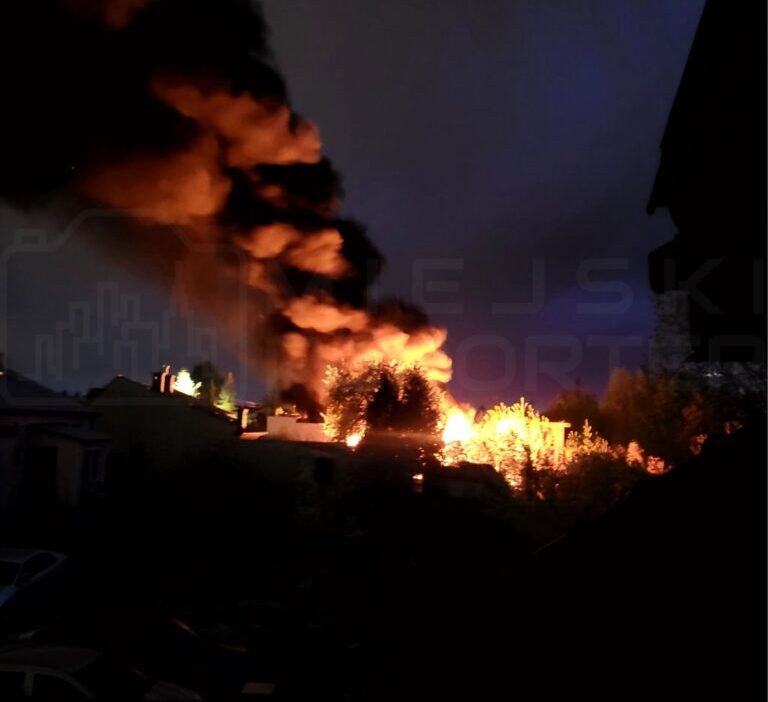 A large fire erupted around 9 PM on Ciećwierza Street in Klaudyna, Warsaw West County. The fire affected waste materials, including bulky items, and two buildings on the property.