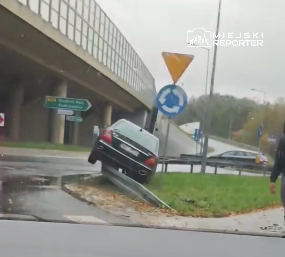 Around 13:00 a Mercedes collided with energy‑absorbing barriers at the exit from the S8 onto the Radziejowice roundabout, causing the vehicle to become lodged on the barriers. No injuries were reported.