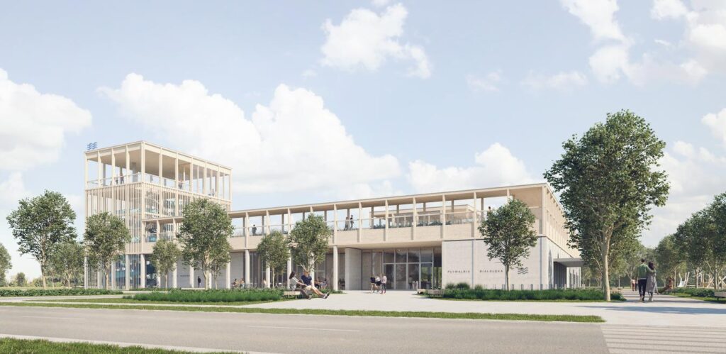 A new city pool building with a sports hall, stands and a rooftop garden is slated for construction on Ostródzka Street in Białołęka, with completion targeted for the second half of 2027.