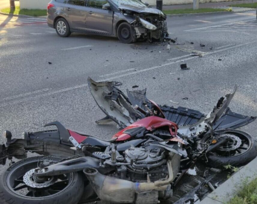 A 49-year-old motorcyclist was hospitalized after colliding with a car on September 21 at around 4:15 PM at the intersection of Geodetów and Nowa Wieś streets in Wołomin.