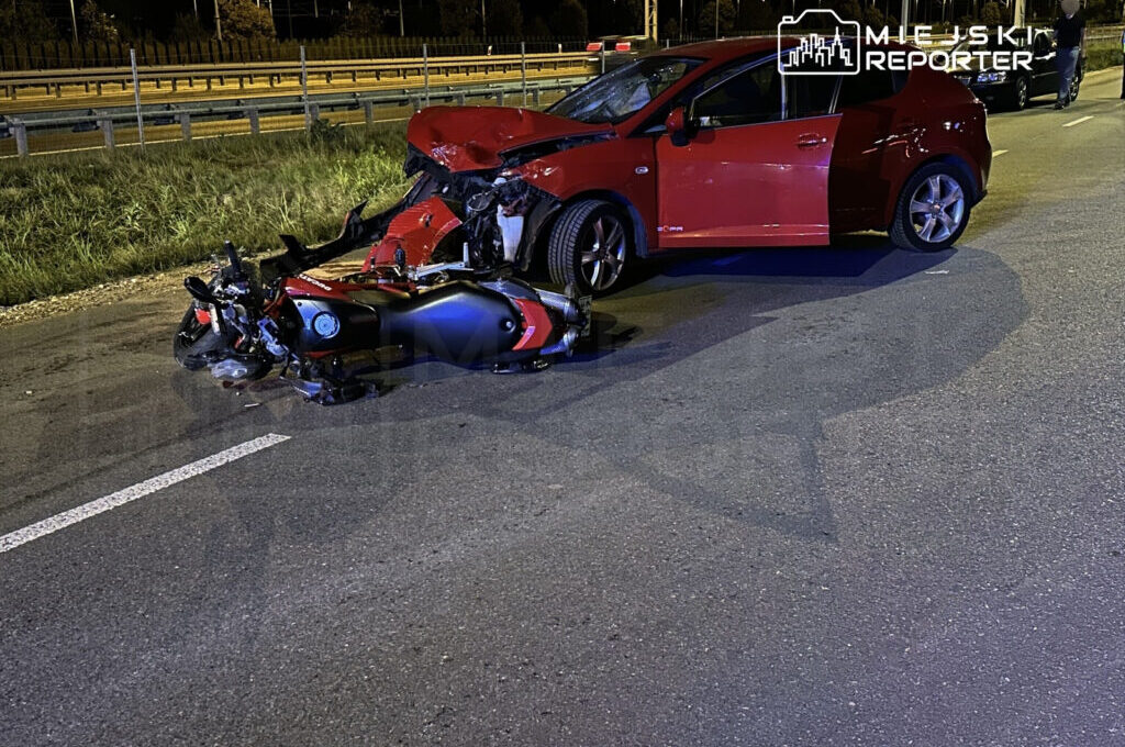 A motorcyclist was taken to the hospital and traffic was blocked on Wydawnicza Street near Chopin Airport after a collision with a Seat car late Monday night. The car driver was found to have been sober.