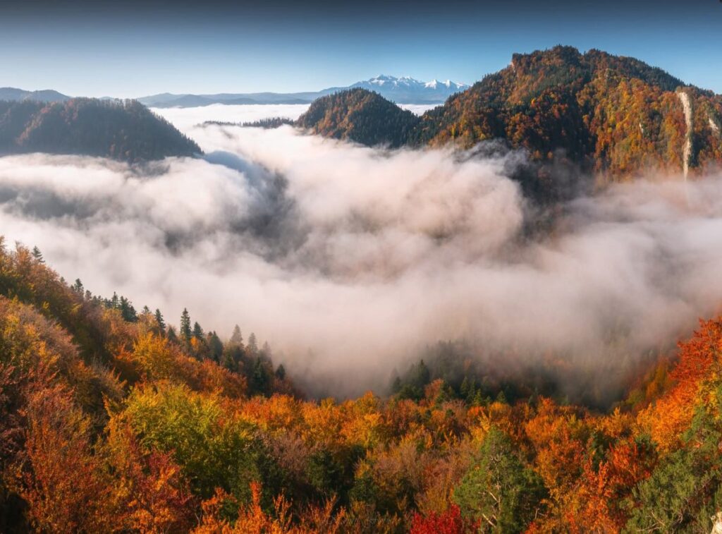 In the Polish mountains last month, a rare “sea of mist” covered valleys for weeks, formed by high humidity and calm winds in an upper‑level high‑pressure system.