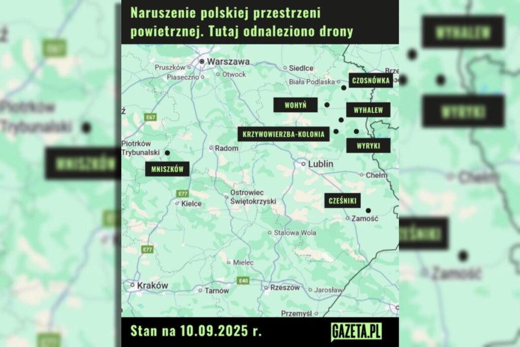 Authorities have identified locations in the Lublin Voivodeship where drones were found, including Czosnówka, Wyryki, Cześniki, Wohyń, Wyhalew in Krzywowierzba-Kolonia, Mniszków, and Oleśno.