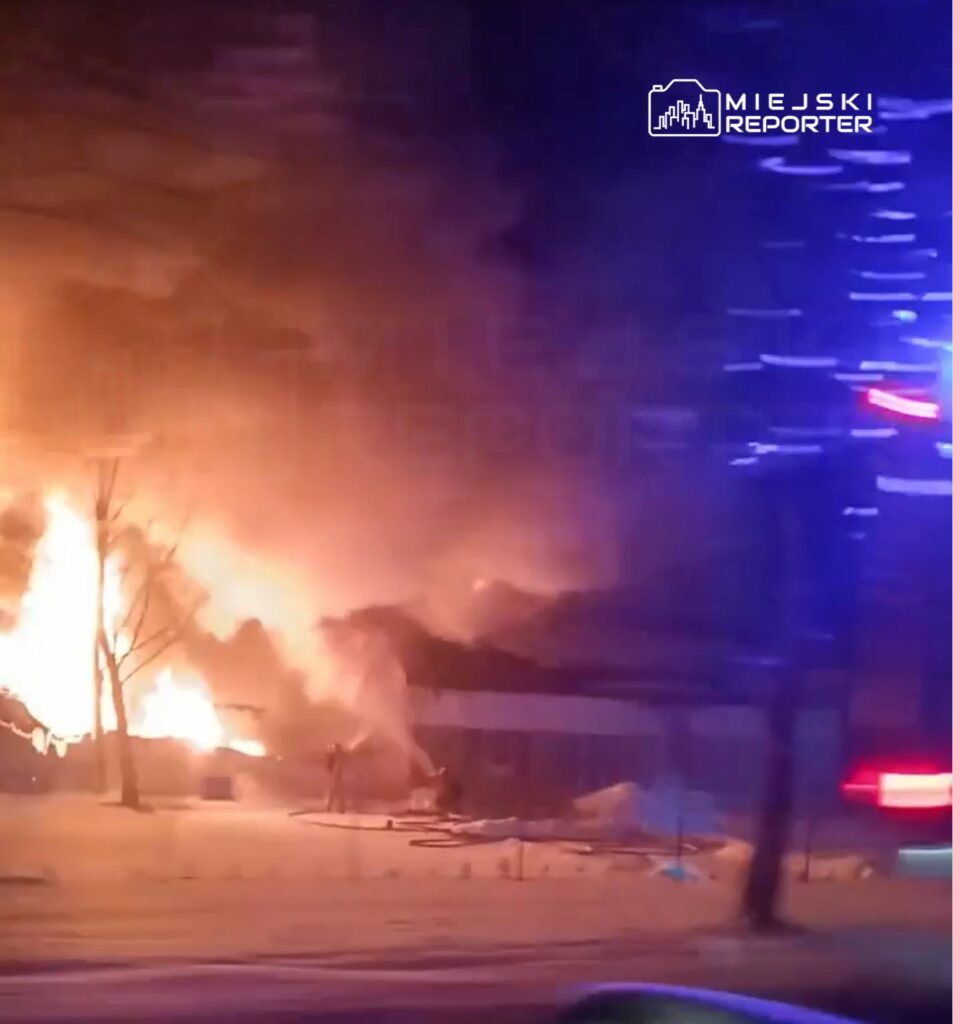 On Wednesday, February 18th, at 4:37 AM, a fire broke out at a furniture production facility located in Dzierżenin (Pokrzywnica commune, Pułtusk county), directly adjacent to national road no. 61. The fire engulfed a section of container workshops and rapidly spread to an adjacent building.