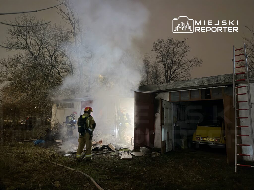 A fire broke out at about 11:00 p.m. on Marywilska Street in Białołęka, destroying a garage box and prompting a coordinated response from firefighters and police.