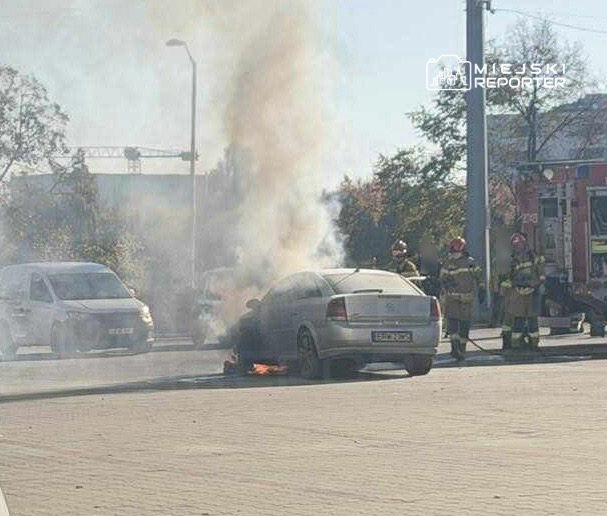 An Opel passenger car caught fire in the parking lot of the Jutrzenki street mall in Włochy, with the engine compartment engulfed and the front section destroyed, but no injuries reported.