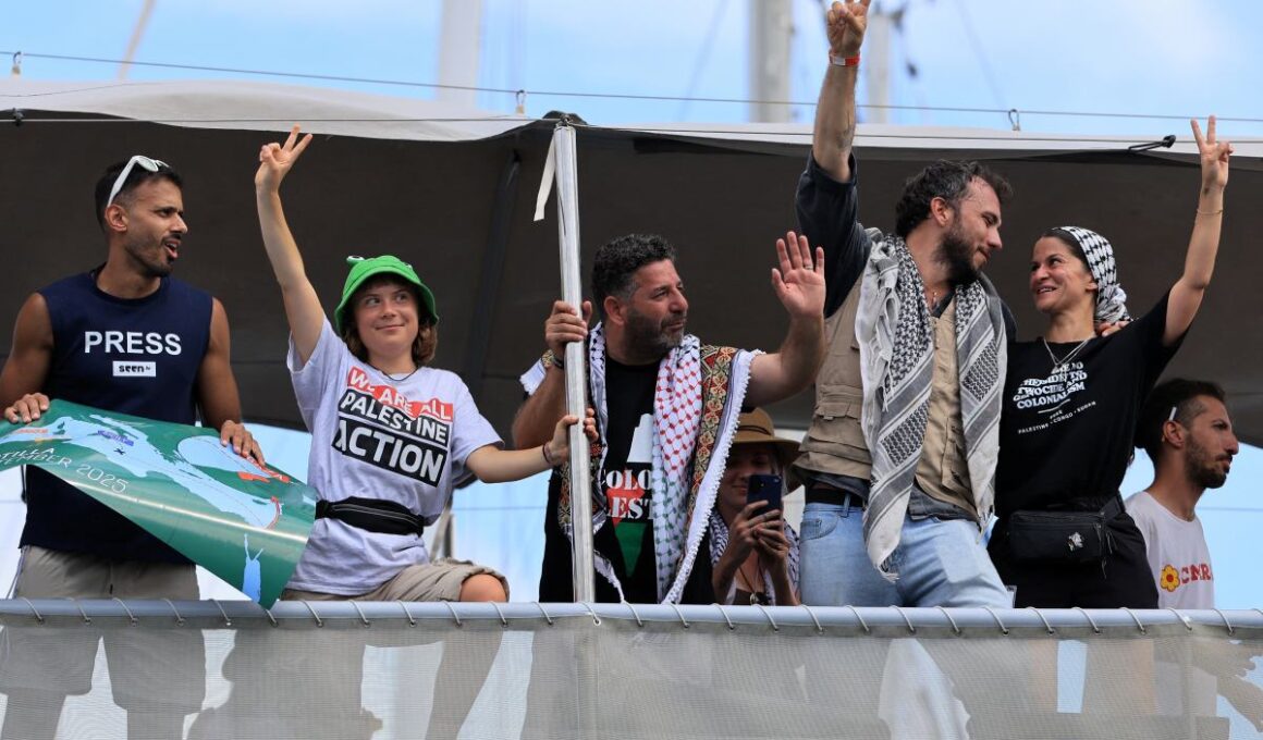 Thousands of people gathered in the Spanish port to bid farewell to the ships, waving Palestinian flags and chanting slogans like “Free Palestine” and “It’s not war, it’s genocide.”