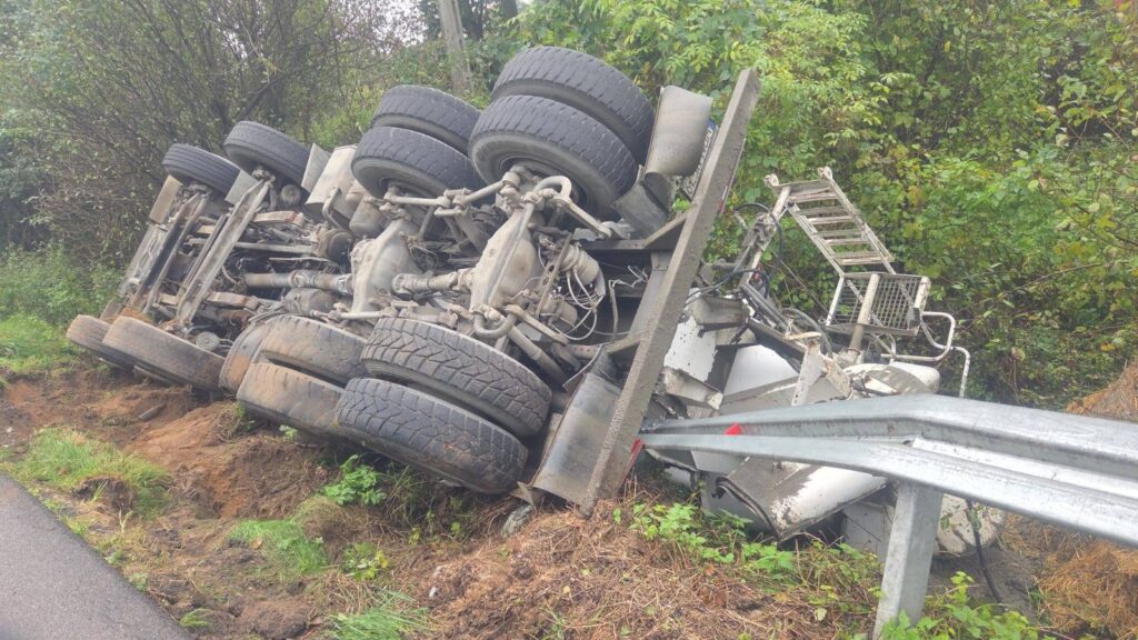 Police say the driver was coming from Cempkowo when another truck equipped with a boom was approaching from the opposite direction. Both drivers pulled onto the shoulder to pass each other, but the “gruszka” driver veered too far off the road, losing stability and rolling into the ditch.
