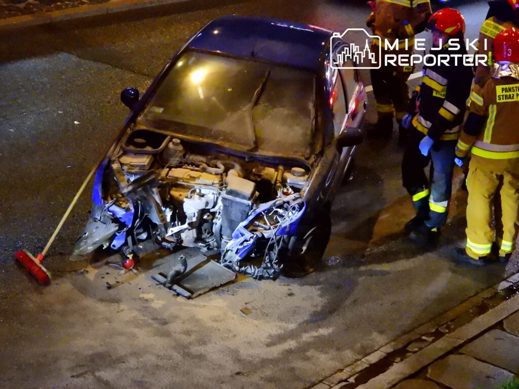 After midnight, a Peugeot driver crashed into energy‑absorbing barriers at Armii Ludowego alley near the Jazdy Polskiej roundabout, causing no injuries and prompting police and fire services to respond.