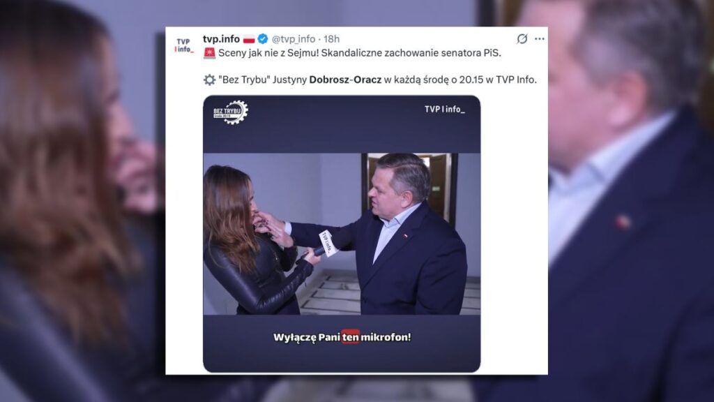 On Monday, PiS Senator Wojciech Skurkiewicz tried to yank the microphone from TVP journalist Justyna Dobrosz‑Oracz during a parliamentary interview, leading to an ethics committee complaint.
